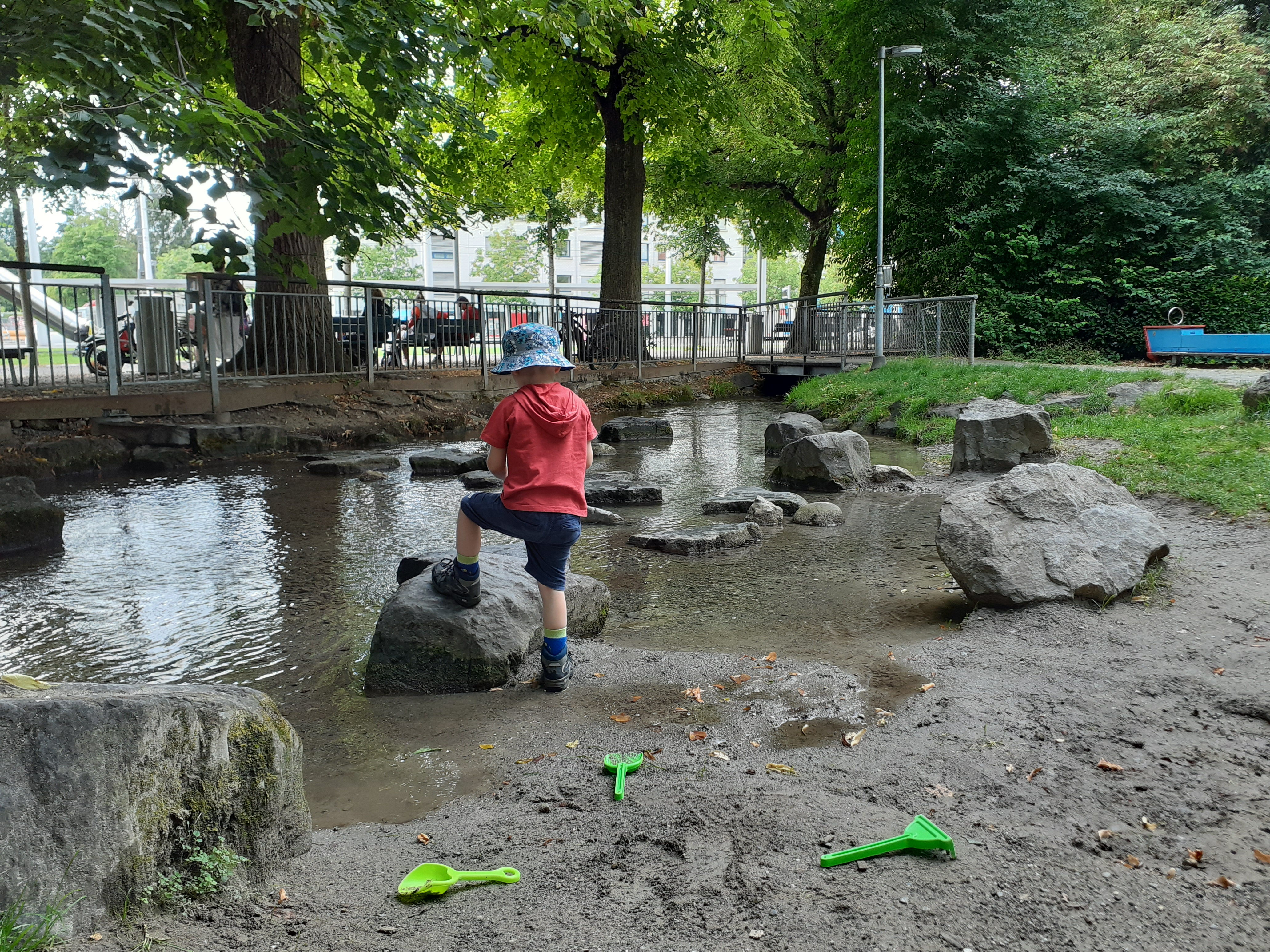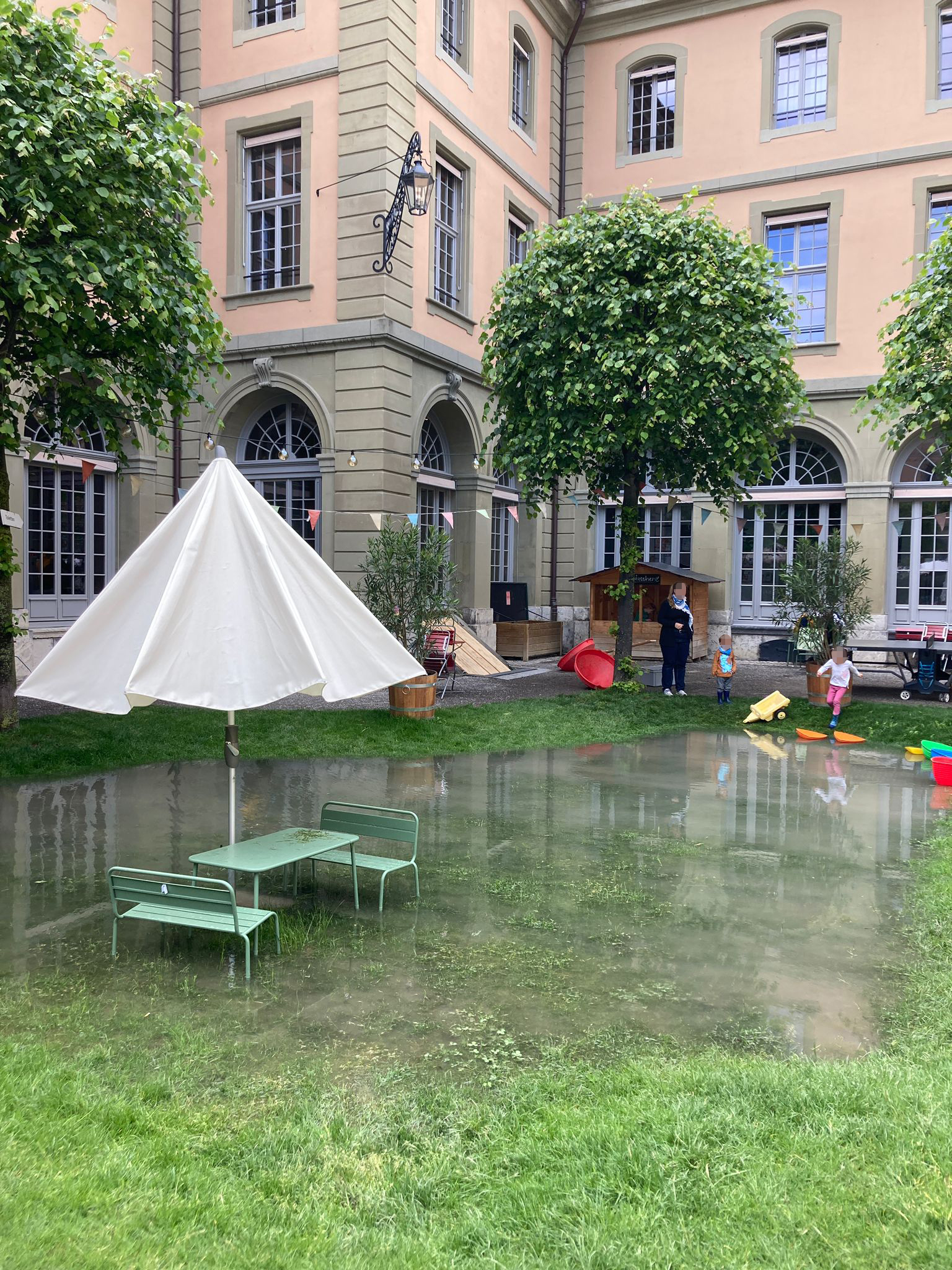 - Certaines de ces surfaces sont conçues pour retenir régulièrement l’eau de pluie pendant quelques heures et ne sont alors retenues que sur quelques centimètres, comme par exemple Vulkanplatz à Zurich Altstetten. Dans ce cas, il est toujours possible de marcher sur la place. En revanche, d’autres surfaces, comme les places de Rotterdam, sont délibérément conçues comme des volumes de rétention pour les fortes pluies et ne devraient être entièrement endiguées qu’une fois tous les deux ans. Dans ce cas, il n’est pas possible de se rendre sur les places pendant la période de rétention.