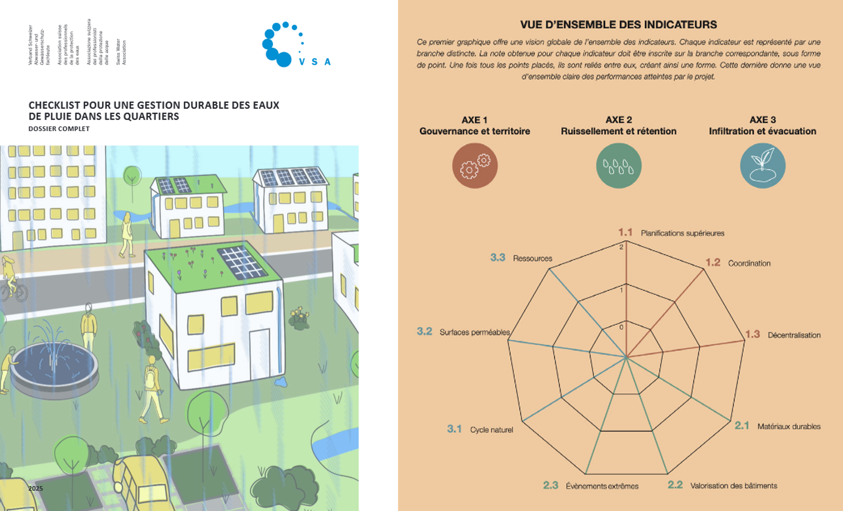 À l’initiative du canton de Fribourg et de son « Antenne Quartiers durables », le VSA a mis au point une checklist « Eau » pour la planification des quartiers. Cette liste contient des conseils utiles, des questionnements et des indicateurs concrets pour la gestion des eaux pluviales. Elle sert d’outil d’aide pour accompagner les planificateurs de nouveaux quartiers dans la conception d’une gestion durable des eaux pluviales, mais peut aussi servir d’inspiration pour des projets plus petits. Plusieurs exemples d’application illustrent les instruments proposés. La checklsit sera présentée par ses autrices lors du prochain webinaire ville éponge du 28 avril 2025.