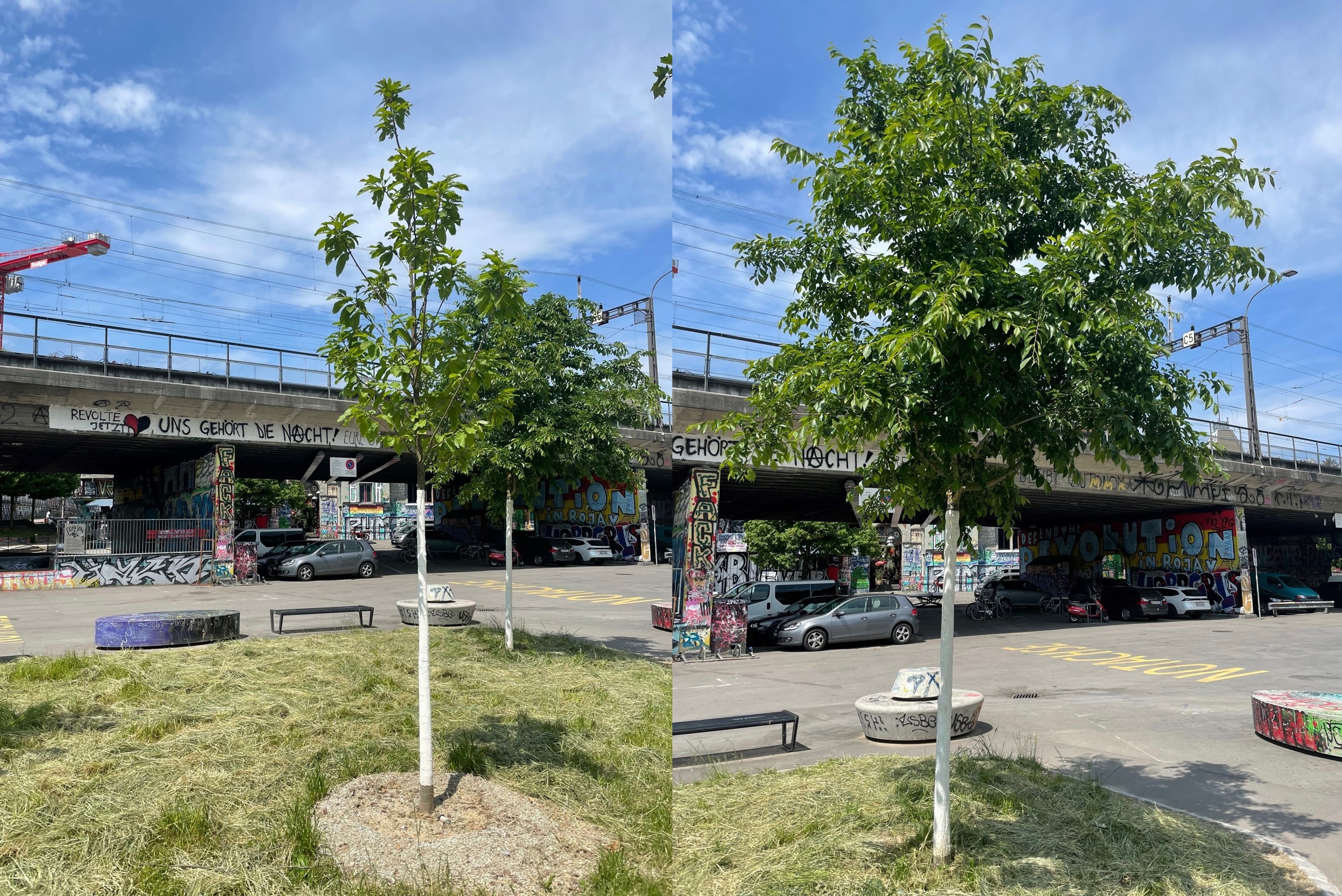 Les arbres plantés à titre expérimental constituent le cœur du projet. Ces arbres ont été dotés d’un substrat capable d’absorber une grande quantité d’eau. Cela permet de mieux garantir l’approvisionnement en eau pendant les périodes de sécheresse prolongées. L’essai doit donc permettre de déterminer quels substrats peuvent être choisis de manière optimale pour les différents sites. On peut considérer que la part de verdure est élevée dans le projet.