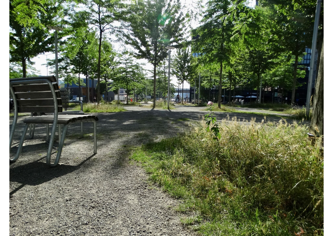 Le nivellement de la place a été conçu de manière à pouvoir stocker jusqu’à 3 cm en surface avant de déborder sur la route et donc dans les égouts. L’eau de pluie s’infiltre par le biais de la chaussée ou s’écoule en légère pente vers les parterres d’arbres aménagés, où elle s’infiltre également. La plupart des précipitations étant inférieures à 30 mm, environ 80 % des événements pluvieux annuels sont gérés sur place et ne sont pas rejetés dans les canalisations. La légère surélévation a été réalisée de manière à être accessible aux personnes handicapées, de sorte qu’elle ne constitue pas un obstacle.