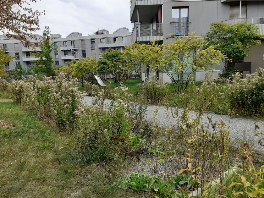 La revalorisation spatiale de la cité Zurlinden des années 1920, classée monument historique, avait pour objectif de revaloriser les espaces libres autour de l’ancienne cité ouvrière du point de vue du climat et de l’écologie urbaine, tout en créant un espace vivant du quotidien. La cour asphaltée ouverte sur la Fritschiwiese est ainsi devenue une « arrière-cour enherbée », qui a une influence positive tant sur le microclimat et la biodiversité que sur la qualité de vie.